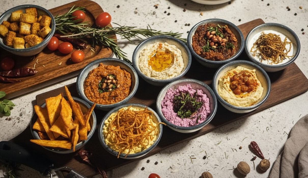 The Muammara walnut dip combines toasted walnuts, red pepper paste, garlic, and olive oil for a rich, smoky spread. Its textured blend of breadcrumbs and spices keeps each bite interesting.